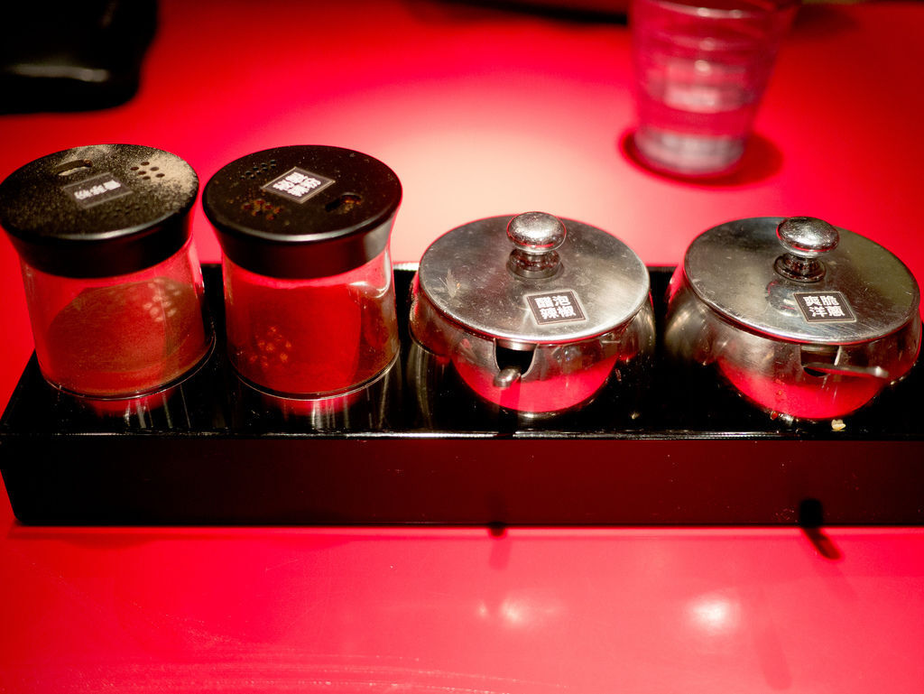 桌上擺有四罐調味料:秘製辣椒粉、香茅粉、醋泡辣椒、爽脆洋蔥